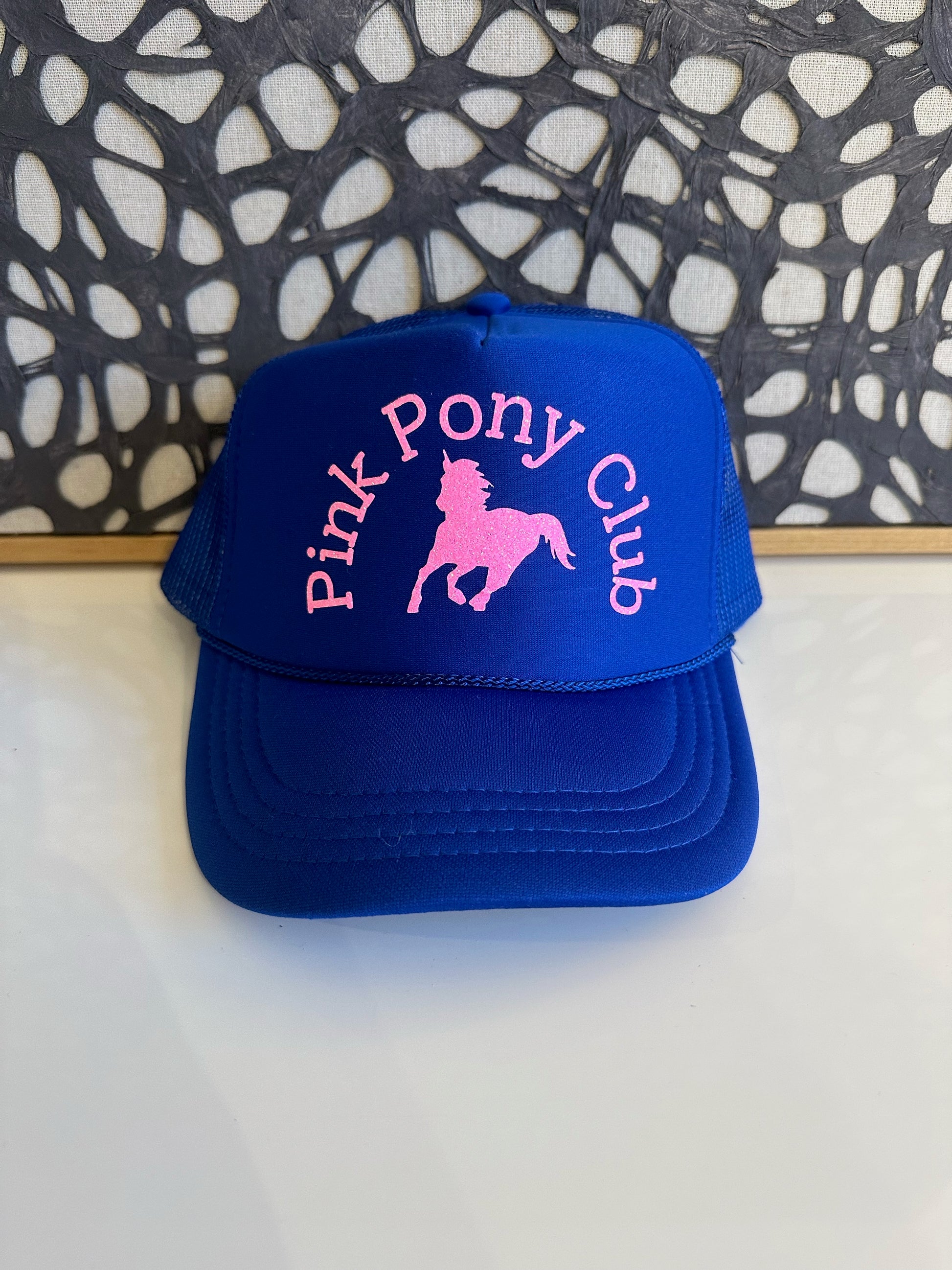 Youth Pink Pony Club on Royal Trucker with Pink Glitter Font.